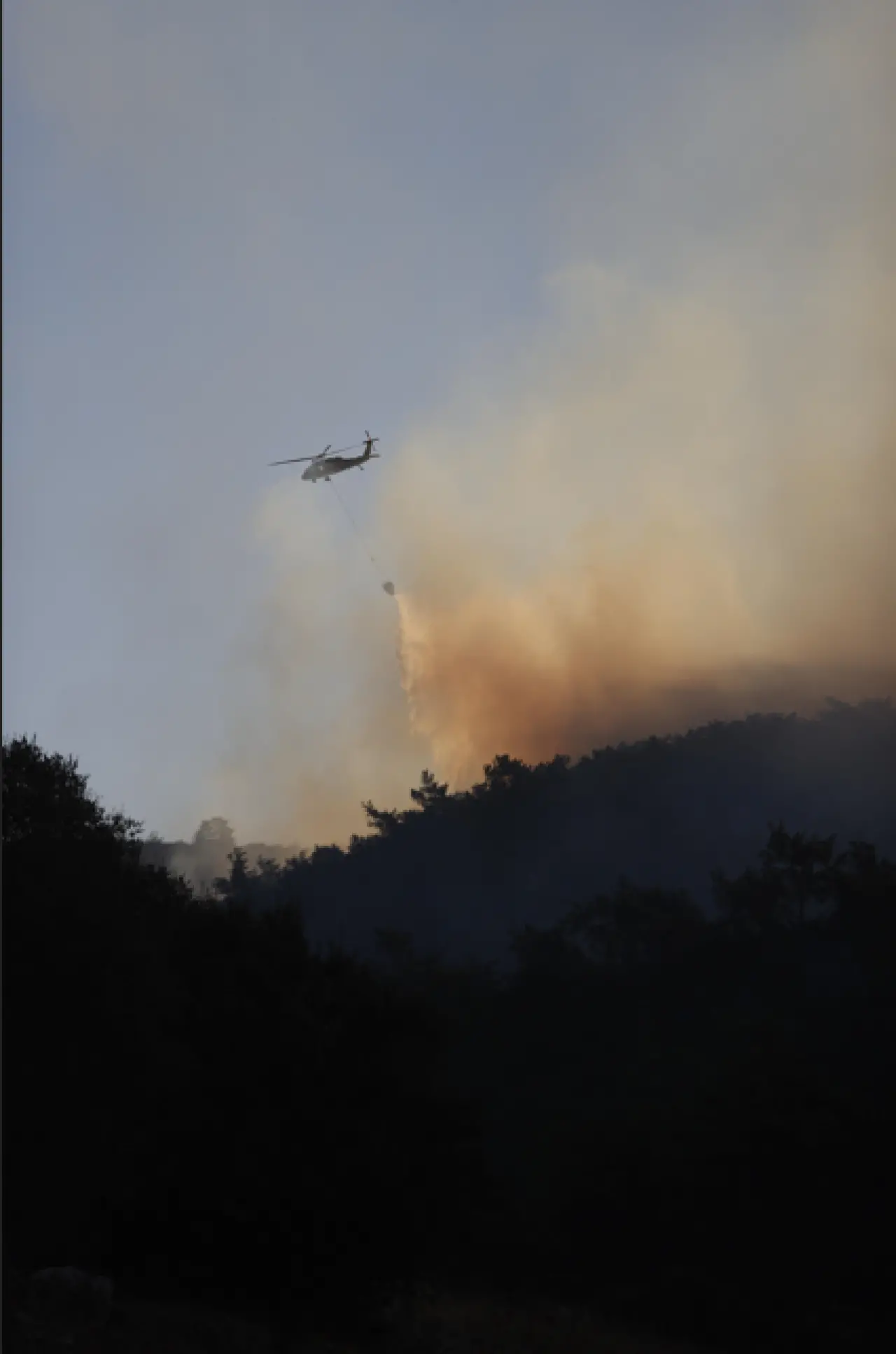 Günün ağarmasıyla hava araçları da alevlere müdahale etmeye başladı.