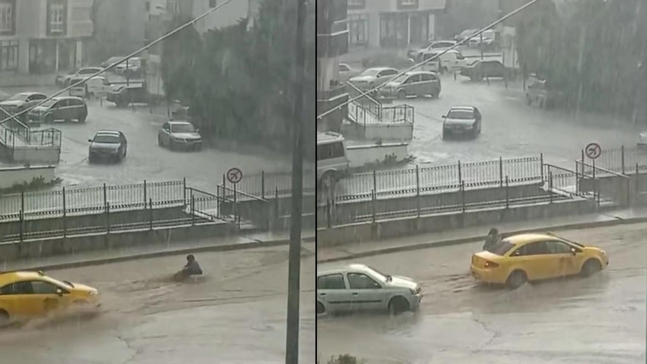 Öte yandan, yolun karşısına geçmeye çalışan bir kadın, sel suyuna kapıldı. O sırada seyir halinde olan taksici Tahsin Aydın, aracıyla suyun hızını kesmek için taksisini kadının önüne park etti. Suyun hızını kesen taksici, daha sonra kadını aracına alarak sel suyundan kurtardı. O anlar ise çevredeki bir vatandaş tarafından cep telefonu kamerasıyla kaydedildi.