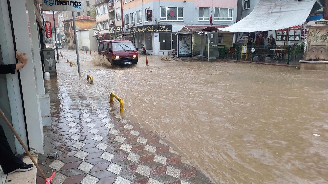 Balıkesir'in Edremit ilçesinde, aniden bastıran ve 5 dakika süren sağanak Çayiçi Caddesi'ni dereye çevirdi. Sürücüler, araçlarıyla caddede ilerlemekte güçlük çekerken, esnaf ise yağmur sularının iş yerlerine girmemesi için çalıştı.