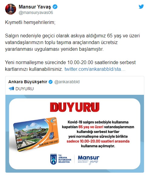 Yavaş, “Kıymetli hemşehrilerim; Salgın nedeniyle geçici olarak askıya aldığımız 65 yaş ve üzeri vatandaşlarımızın toplu taşıma araçlarından ücretsiz yararlanması uygulaması yeniden başlamıştır. Yeni normalleşme sürecinde 10.00-20.00 saatlerinde serbest kartlarınızı kullanabilirsiniz” ifadesini kullandı.