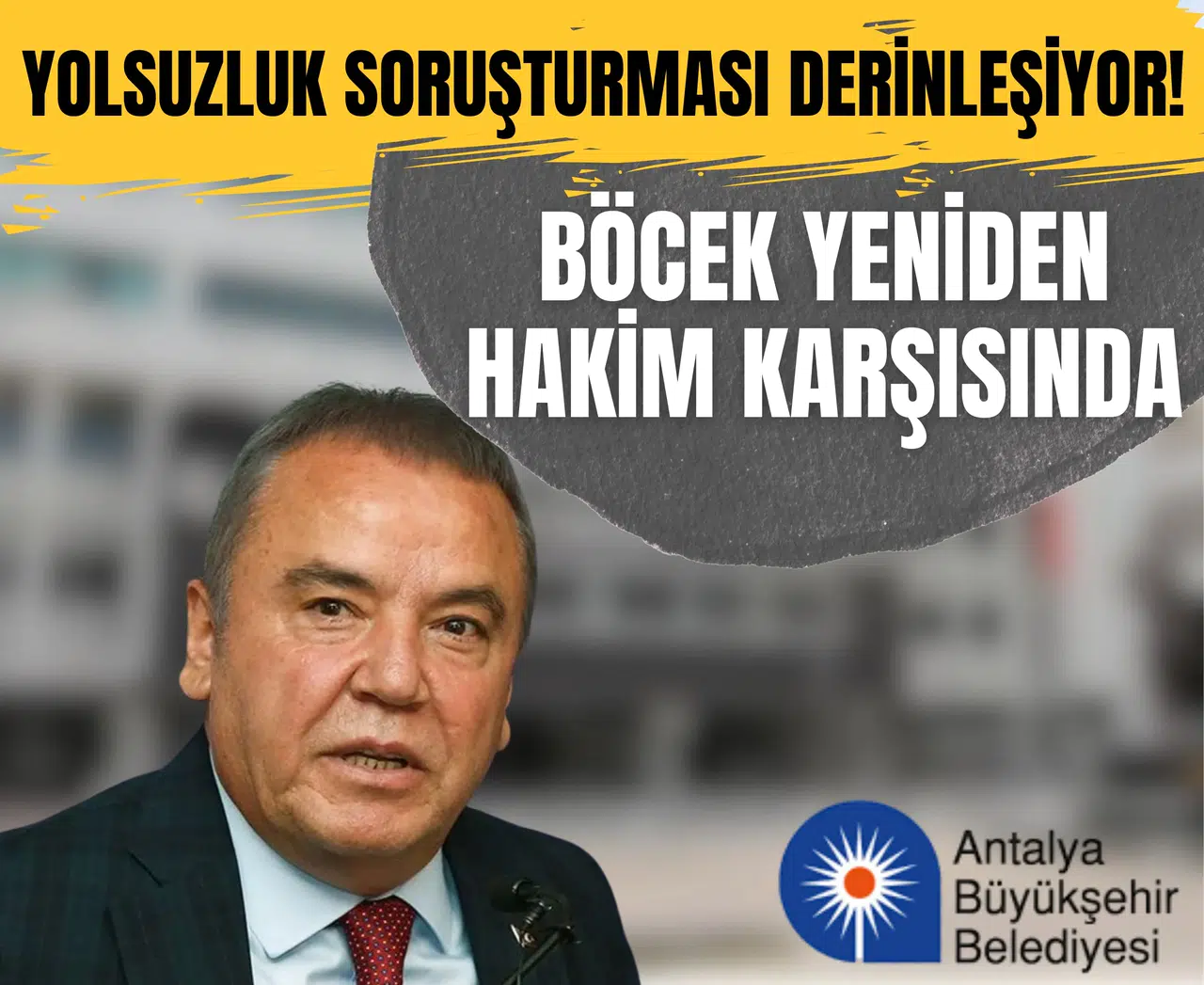 Antalya Büyükşehir Belediyesine yönelik yürütülen “rüşvet” ve “yolsuzluk” soruşturması kapsamında tutuklanan ve görevden uzaklaştırılan eski Antalya Büyükşehir Belediye Başkanı Muhittin Böcek ile birlikte 6 şüpheliden ek ifade alınacağı öğrenildi.