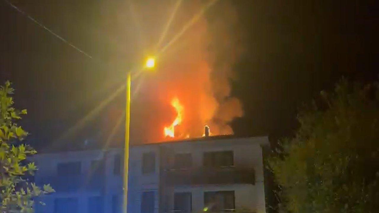 Düzce'de gece saatlerinde üç katlı apartmanın çatısı, çıkan yangında alev alev yandı.