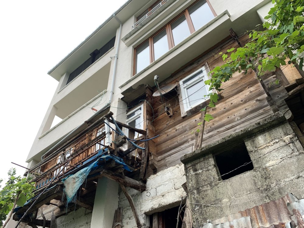 İstanbul'da yaşayan ve her yıl ilçenin Büyükköy beldesine bağlı Derecik köylerine gelen İlyas ve İbrahim Çelik kardeşler, anne ve babasının evlenirken yaptığı ve yaşamlarını sürdürdükleri 53 yıllık ahşap evin yerine iki katlı ev yapmak istedi. Baba Mehmet Çelik, evinin yıkılmasına razı gelmeyince Çelik kardeşler, eski ahşap evin çatısını yıkıp, içinden ve çevresinde diktikleri beton direklerin üzerine iki katlı ev inşa etti. İnşaat 2021'de biterken, geçen yıl 80 yaşındayken babalarını kaybeden iki kardeş, altlı üstlü iki katlı betonarme evde, anne Nihayet Çelik (75) ahşap evde yaşamlarını sürdürüyor.