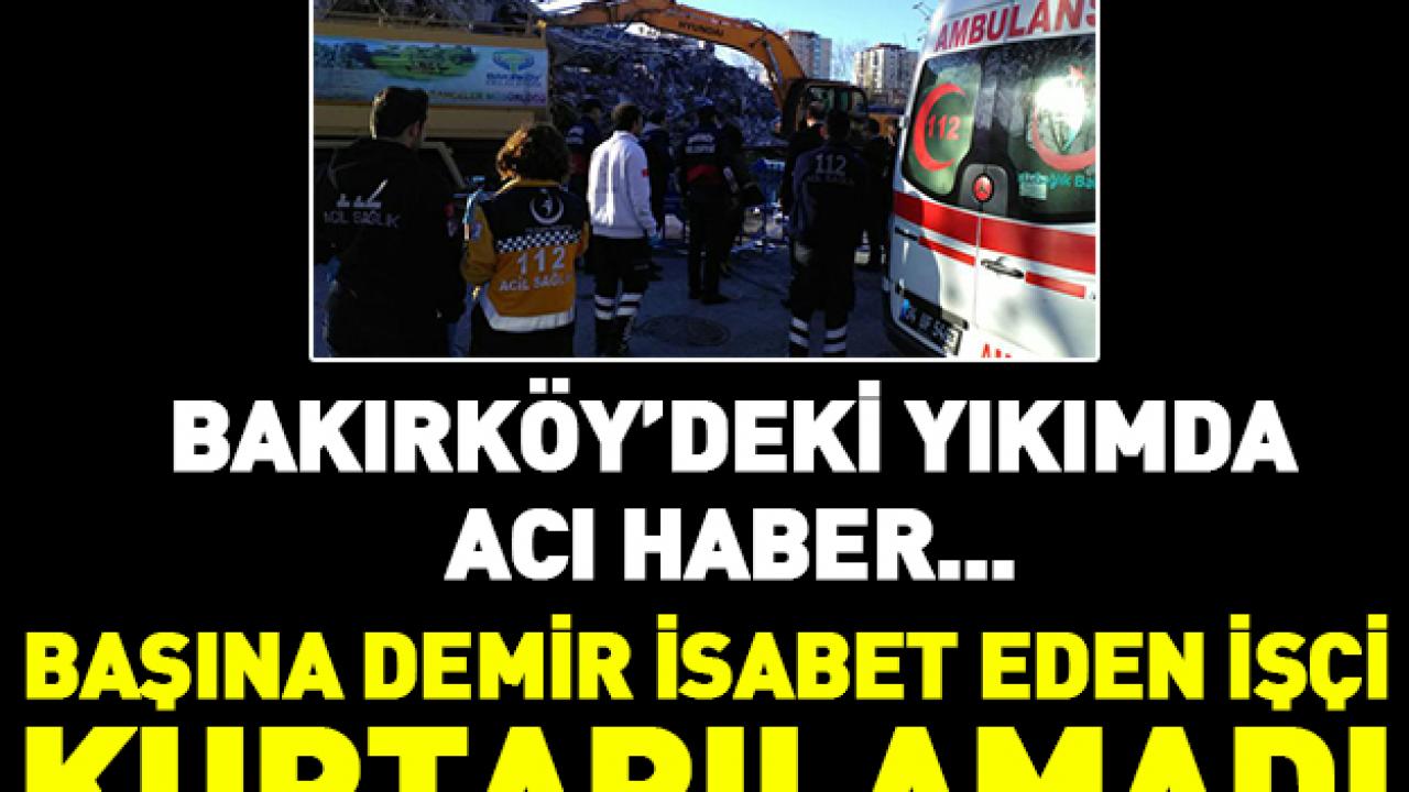 Bakırköy Spor Vakfı Sosyal Tesisleri’nin yıkımı esnasında Bakırköy Belediyesi bünyesinde çalışan bir işçi bu sabah hayatını kaybetti. Birkaç günden beri devam eden yıkımda, başına demir isabet eden işçinin kurtarılamadığı öğrenildi.