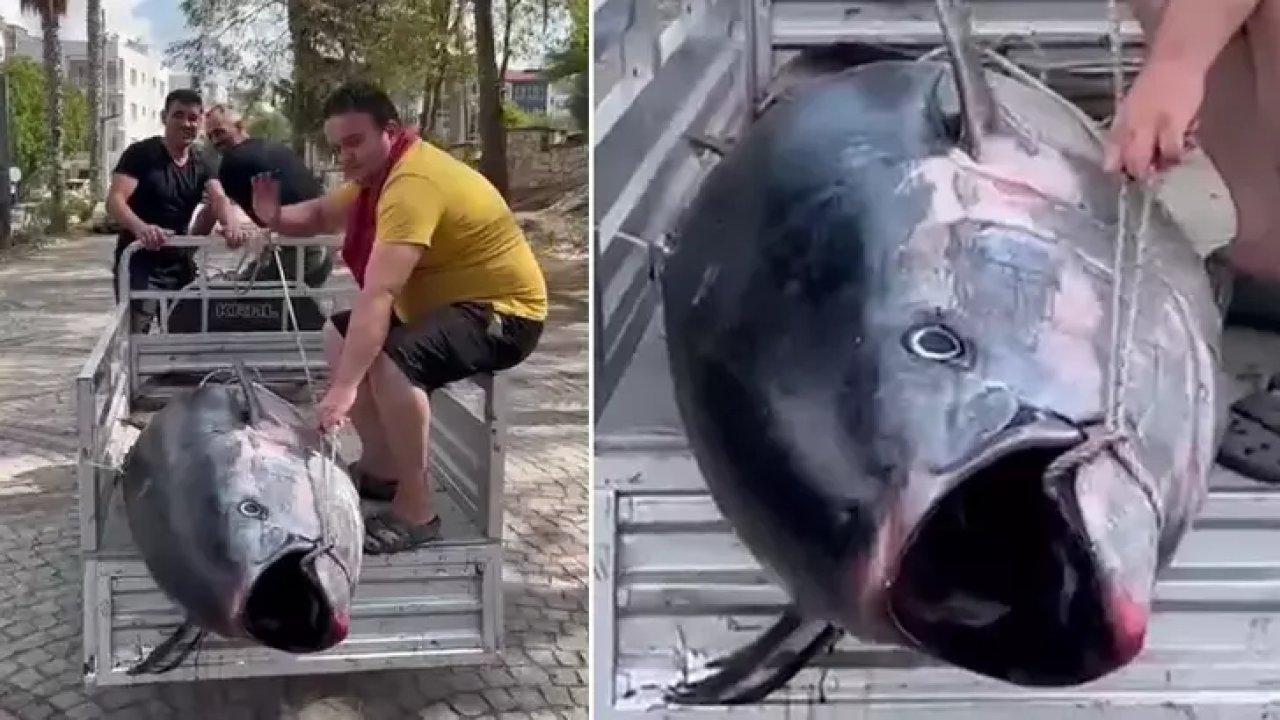 Balıkesir'in Erdek ilçesinde balıkçıların oltasına 207 kilogram ağırlığında orkinos takıldı. Sahile çıkarılan balık, restorana götürüleceği elektrikli motosikletin römorkuna güçlükle yerleştirilirken, o anlar kameraya yansıdı.
