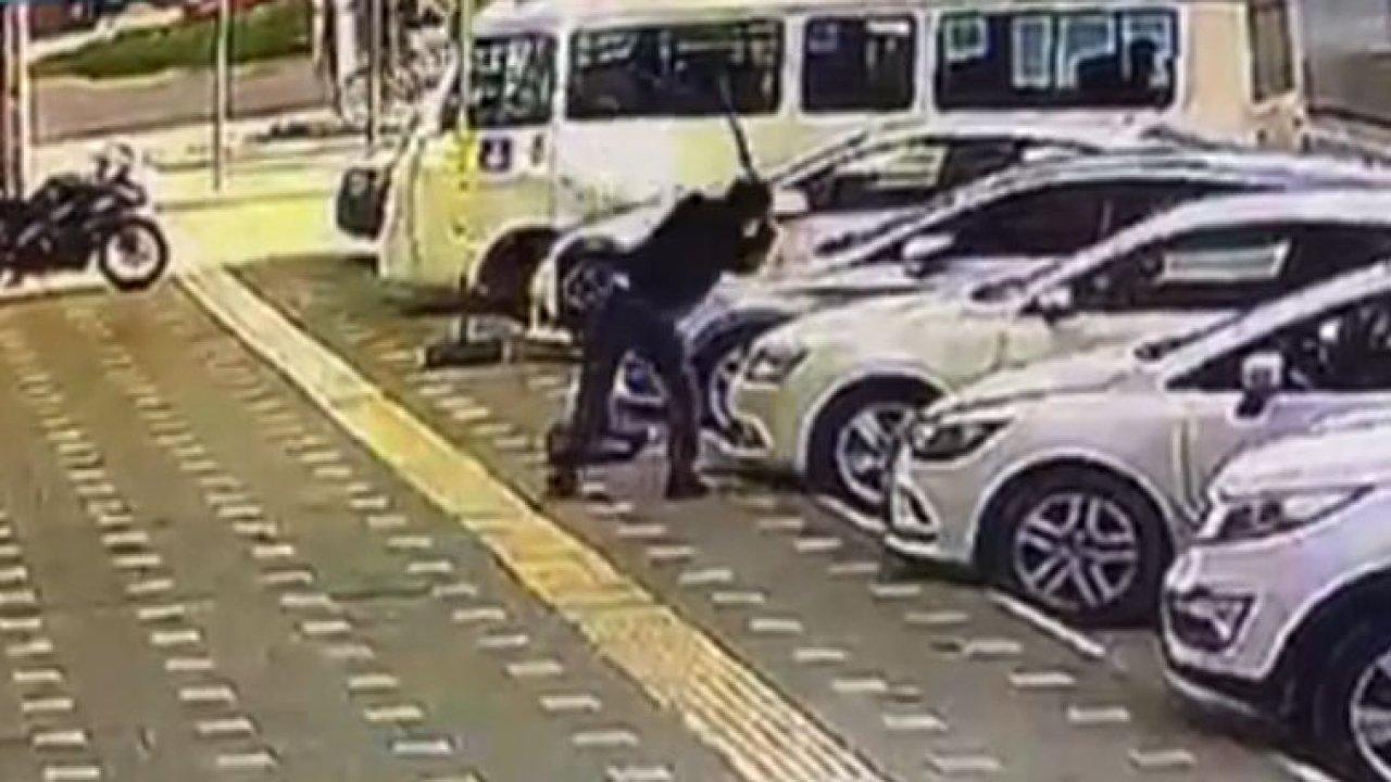 Bursa'da çevredekilere küfür ve hakaretler savuran A.G. (33), elindeki balta ile park halindeki araçlara saldırdı. O anlar kameraya yansırken, şüpheli biber gazı ile etkisiz hale getirilip, gözaltına alındı.