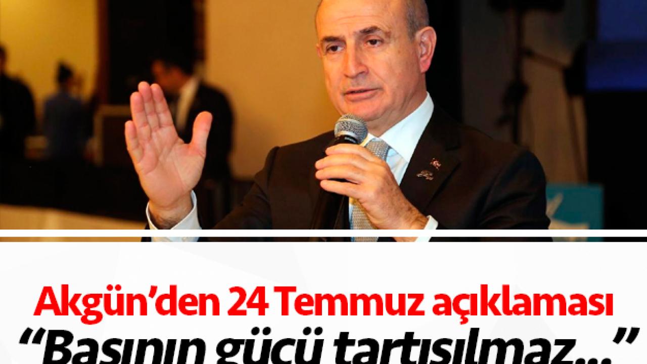 Başkan Dr. Hasan Akgün mesajında şu ifadelere yer verdi: "Basın, öncelikli olarak kamu yararını gözeten, tarafsız ve doğru habercilik anlayışını benimserken, kamuoyunu bilgilendirme görevini meslek ilkelerinden ödün vermeden yerine getirmelidir. Üstlenmiş olduğu bu ulvi görevi yerine getirirken de sansür ve baskılara maruz kalmamalıdır. Türk basınında sansürün kaldırılmasının üzerinden 111 yıl geçmiştir. Ancak üzülerek söylemek gerekirse, basın özgürlüğü ülkemizde halen olması gerektiği yerde değildir. Büyük Önder Gazi Mustafa Kemal Atatürk’ün de belirttiği ‘Basın, bir milletin ortak sesidir.’ Her türlü zorluğa karşın halka sadece doğruları aktararak görevini fedakârlıkla yürüten değerli basın mensuplarımız, her türlü övgü ve takdiri hak etmektedirler. Bu duygu ve düşüncelerle 24 Temmuz Basın Bayramı'nızı kutlar, basın meslek ilkeleri doğrultusunda tarafsız, sorumlu ve bilinçli gazetecilik anlayışıyla yapılan çalışmaların devamını dilerim. Ayrıca görevi başında yaşamını yitiren basın şehitlerimizi de saygı ve rahmetle anıyorum."