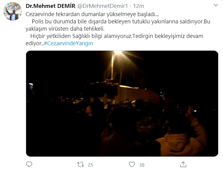 Cezaevinde tekrardan dumanlar yükselmeye başladı... Polis bu durumda bile dışarda bekleyen tutuklu yakınlarına saldırıyor.Bu yaklaşım virüsten daha tehlikeli. Hiçbir yetkiliden Sağlıklı bilgi alamıyoruz.Tedirgin bekleyişimiz devam ediyor..#CezaevindeYangın