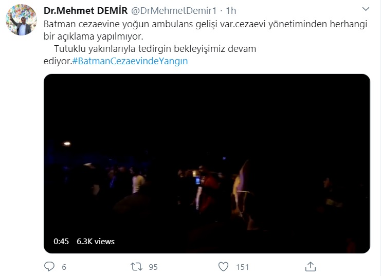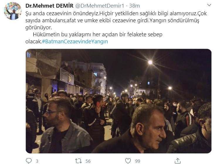 Şu anda cezaevinin önündeyiz.Hiçbir yetkiliden sağlıklı bilgi alamıyoruz.Çok sayıda ambulans,afat ve umke ekibi cezaevine girdi.Yangın söndürülmüş görünüyor. Hükümetin bu yaklaşımı her açıdan bir felakete sebep olacak.#BatmanCezaevindeYangın