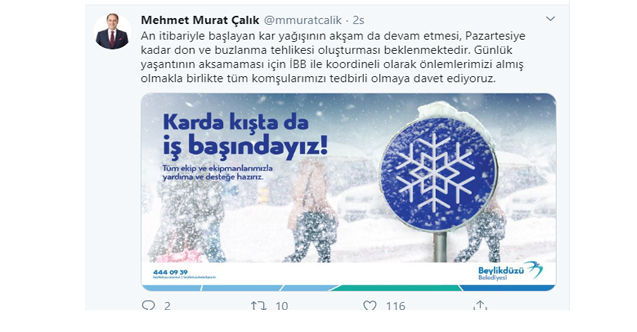 Beylikdüzü Belediye Başkanı M.Murat Çalık resmi twitter hesabından paylaşımda bulunarak,''İBB ile koordineli olarak önlemlerimizi almış olmakla birlikte tüm komşularımızı tedbirli olmaya davet ediyoruz'' ifadelerini kullandı.