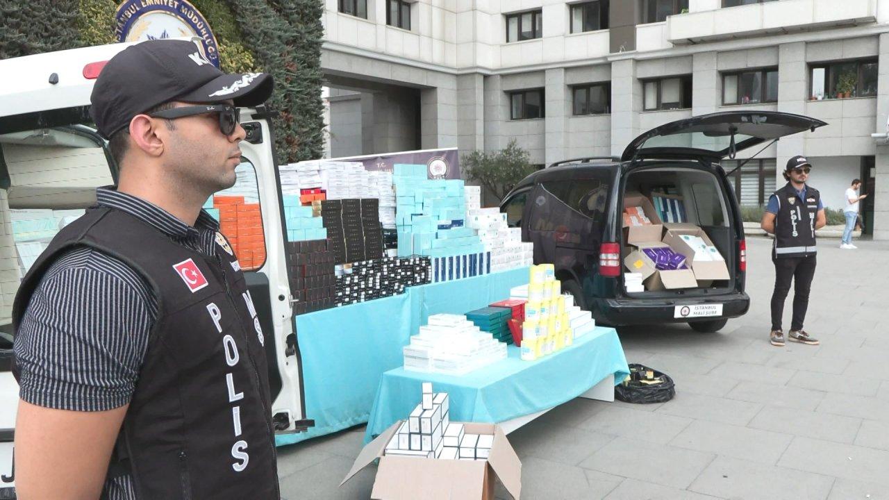 Ele geçirilen sahte ilaç ve diğer malzemeler, İstanbul Emniyet Müdürlüğü Vatan Yerleşkesinde basın mensuplarına sergilendi.