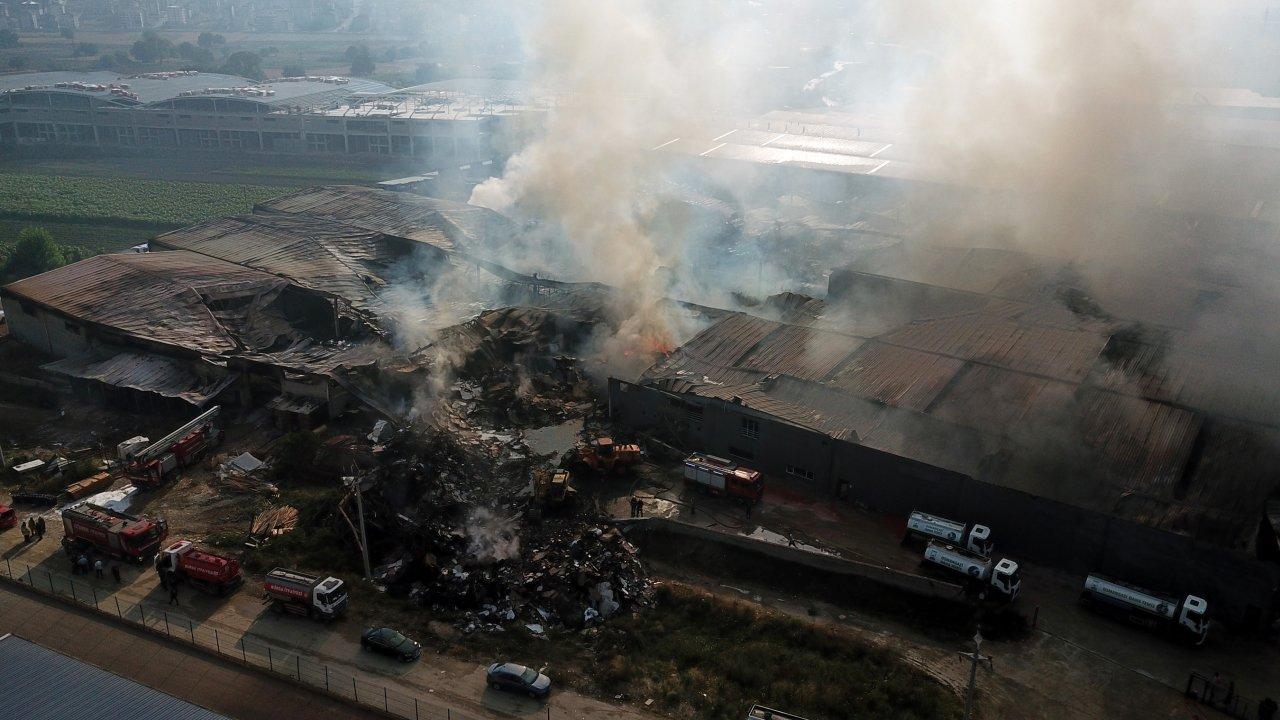 Bursa'nın İnegöl ilçesinde dün 10 fabrikada etkili olan yangın, 7 saat sonra kontrol altına alındı. Bölgede soğutma çalışmaları sürerken, yangının kaynak çalışması sırasında oluşan kıvılcımların süngerlere sıçraması ile çıktığı belirlendi. 110 dönümlük alanın 70 dönümünde etkili olan yangının boyutu, dronla havadan görüntülendi.