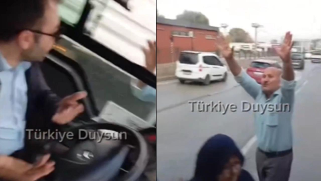 Bursa'da otobüste yer olmadığı içeriye alınmayan yaşlı kadın ve bir adam aracın önünü kesti ve şoförün yoluna devam etmesine izin vermedi.