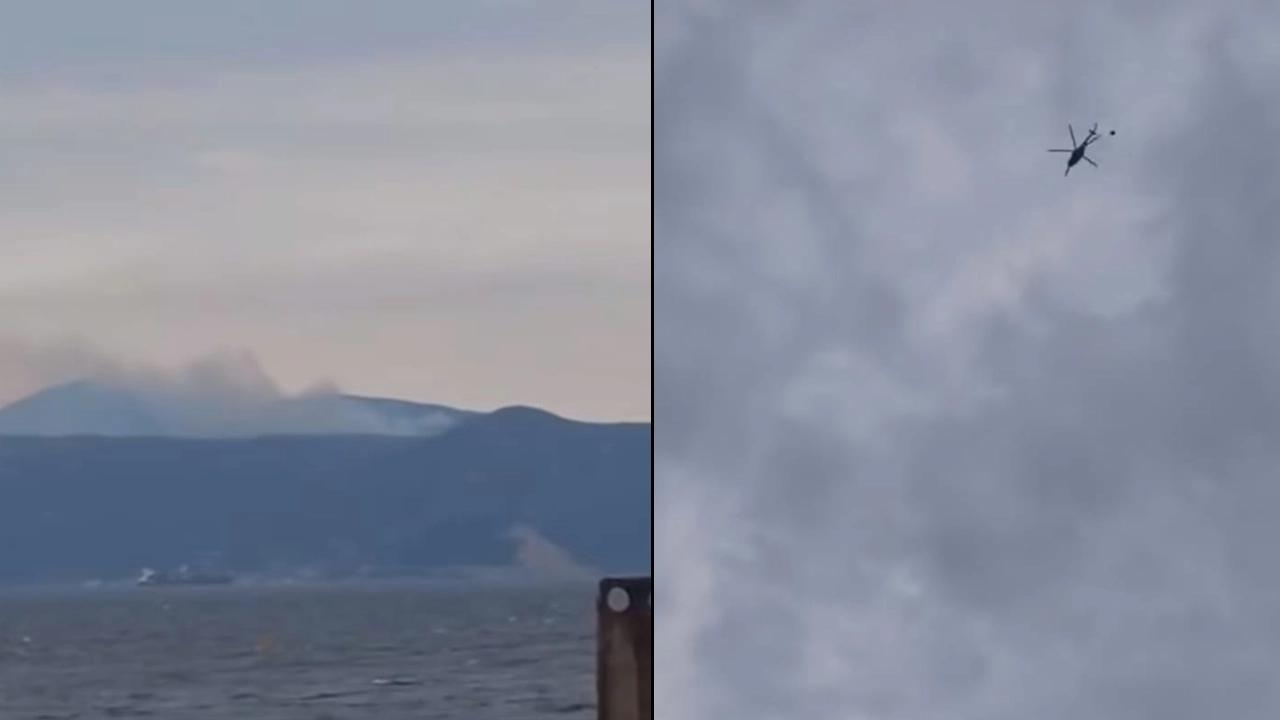 Gökyüzüne yükselen dumanlar kilometrelerce uzaklıktan görülürken, helikopterinde havadan destek sağladığı yangın bir vatandaşın kamerasına yansıdı.