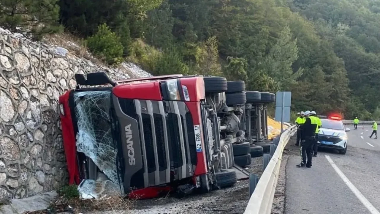 İnegöl’de virajda kontrolden çıkan yem yüklü TIR devrildi, 2 kişi yaralandı
