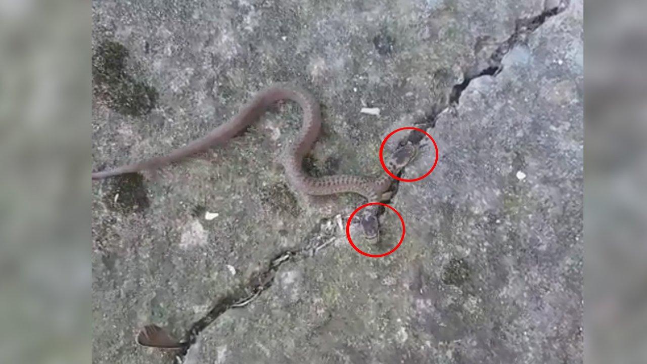 Birlik Mahallesi'nde yaşayan bir çiftçi, evinin önündeki beton zeminde çift başlı bir yılanın süründüğünü fark etti. Şaşkına dönen çiftçi, doğada oldukça nadir rastlanan 50 santimetre uzunluğundaki "Colubridae" familyasından çift başlı yılanı, cep telefonu kamerasıyla görüntüledi. Zehirsiz olduğu öğrenilen hayvan bir süre sonra çimenlik alana yönelerek, gözden kayboldu.