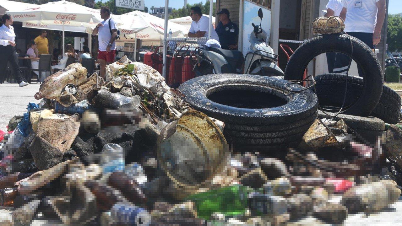 Muğla'nın Bodrum ilçesinde yapılan deniz dibi temizliğinde araç lastiği, cam ve pet şişeler ile cep telefonunun da olduğu 500 kilo atık çıktı.