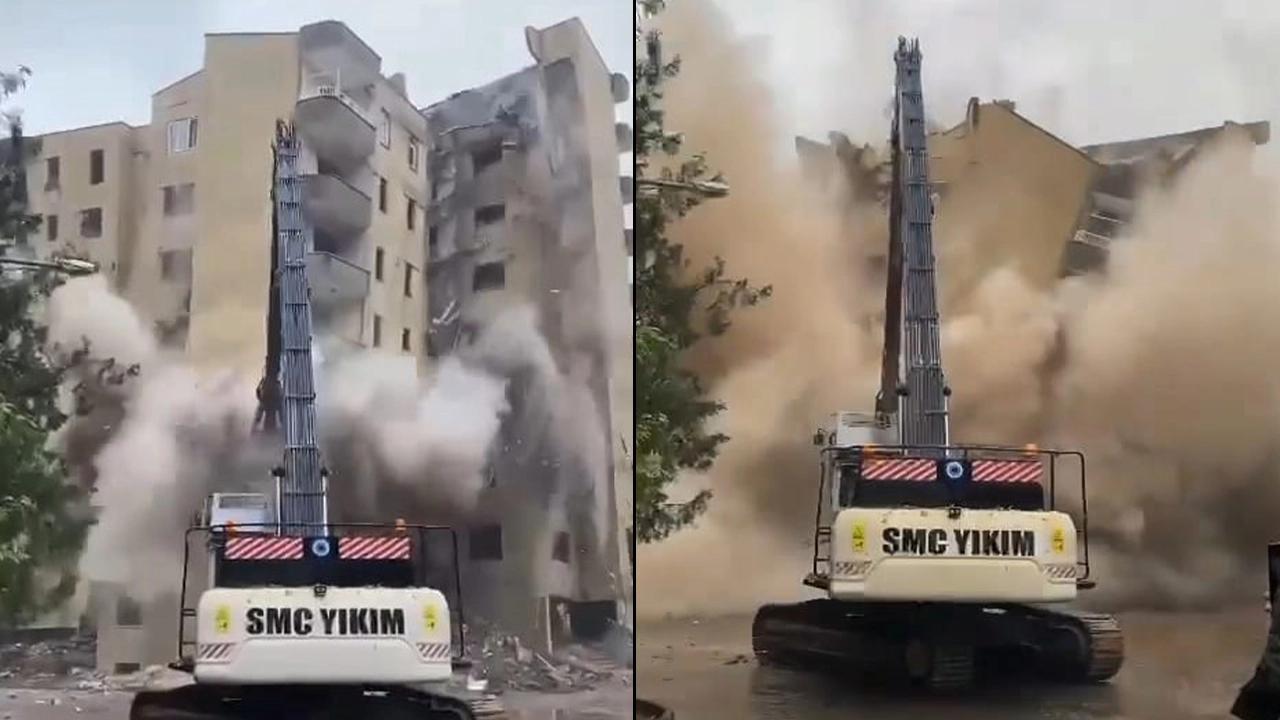 Kahramanmaraş merkezli 6 Şubat'taki depremlerde ağır hasar aldığı için tahliye edilen Bağlar ilçesi Mevlana Halit Mahallesi'ndeki 9 katlı bina, kontrollü yıkım sırasında çöktü.