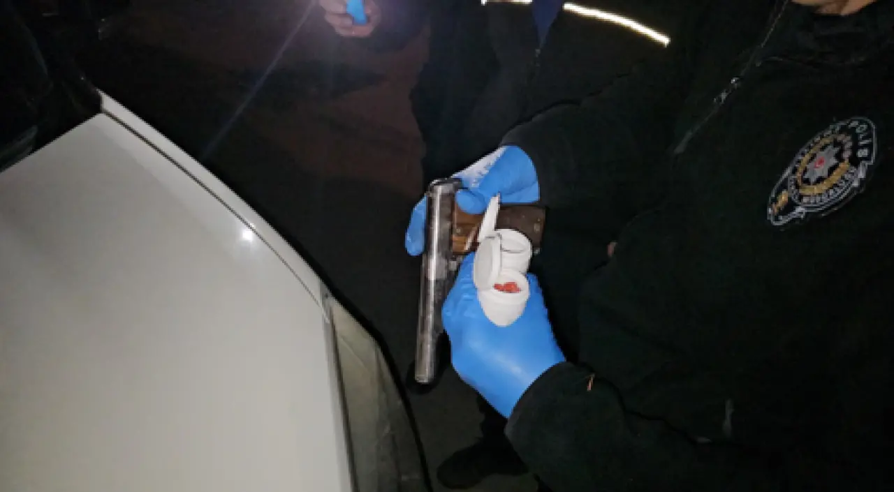 Araçta yapılan aramada, tabanca ve tabancaya ait fişek ile 104 sentetik ecza hapı ele geçirildi.