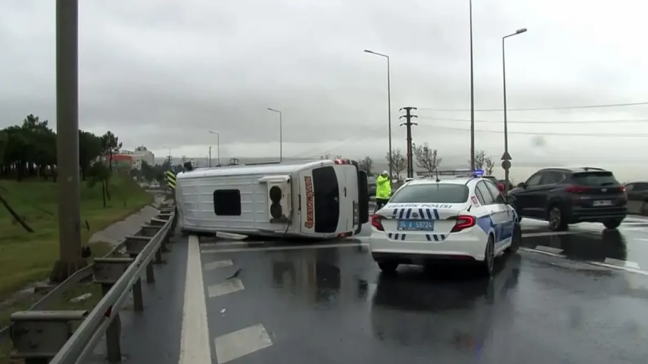 İstanbul’da etkili olay yağmurun ardından E-5 Güzelce mevkii Büyükçekmece istikametinde hafriyat kamyonu kayganlaşan yolda devrildi. Yol trafiğe kapanırken, kaza anı kameraya yansıdı.