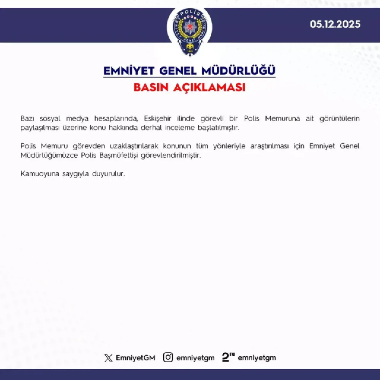 “Bazı sosyal medya hesaplarında Eskişehir’de görevli bir polis mensubuna ait görüntülerin paylaşılması üzerine derhal inceleme başlatılmış, ilgili personel görevden uzaklaştırılmıştır. Konu tüm yönleriyle araştırılmaktadır.”