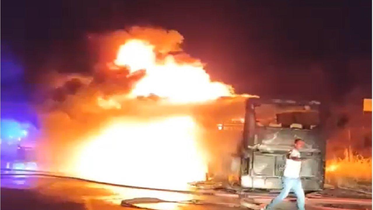 Malatya'nın Akçadağ ilçesinde seyir halindeyken motor kısmından alev alan yolcu otobüsü, yanarak kullanılmaz hale geldi. Yolcular tahliye edilirken, otobüsün alev topuna döndüğü o anlar ise kameraya yansıdı.