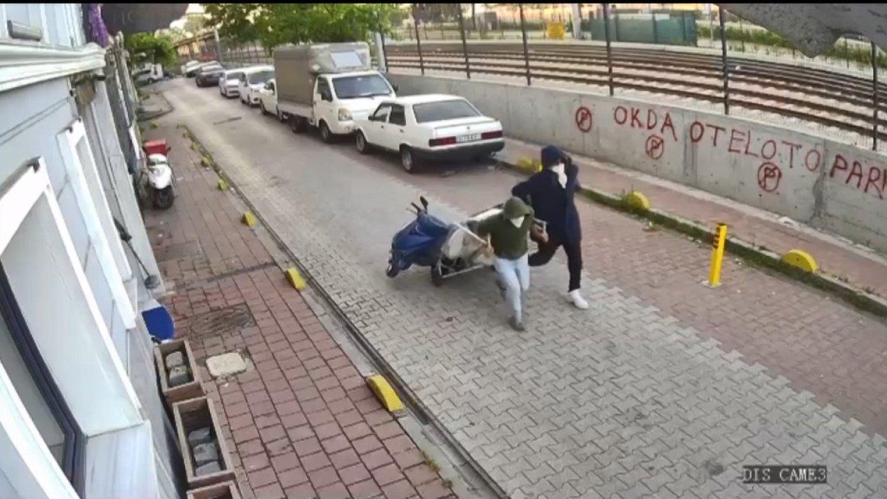 Şüphelilerin motosikleti çalarak el arabasıyla götürdükleri anları ise güvenlik kameralarına yansıdı.