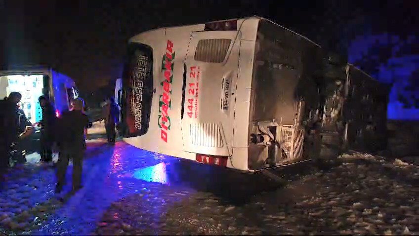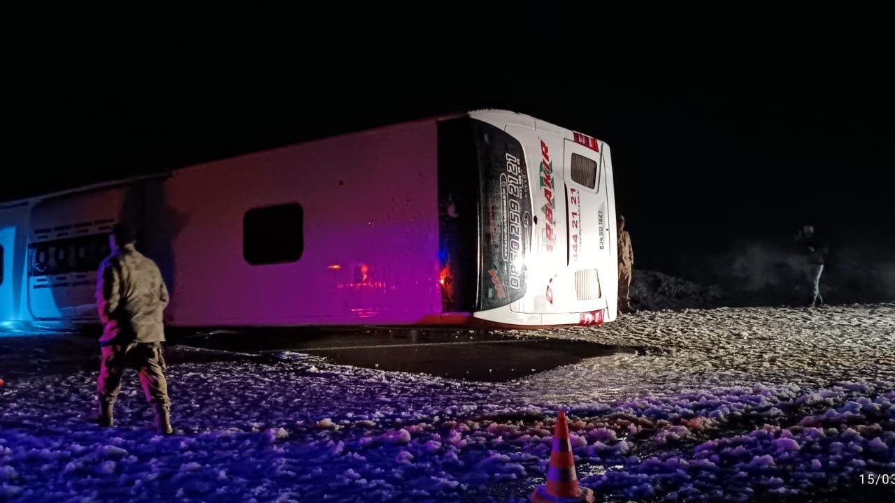 Kaza, akşam saatlerinde Karlıova- Erzurum karayolunda meydana geldi. Kar yağışının etkili olduğu yolda sürücüsünün ismi öğrenilemeyen 34 SD 1821 plakalı Star Diyarbakır firmasına ait yolcu otobüsü, kontrolden çıkarak devrildi.