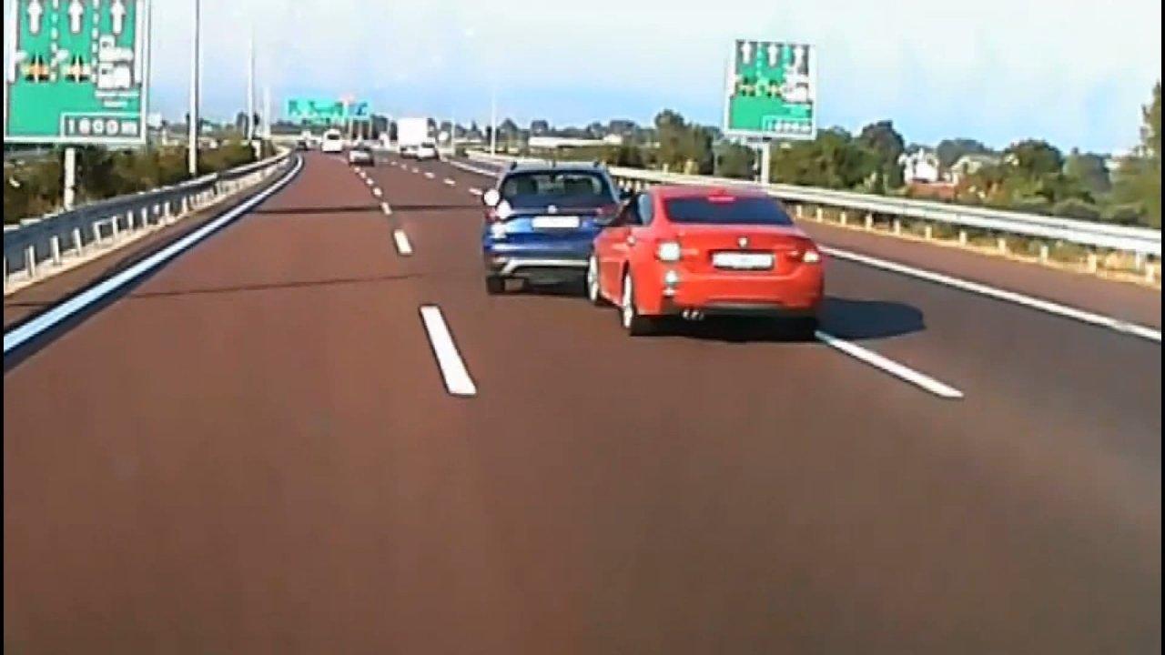 Takip edildiğini anlayan mavi renkli otomobilin sürücüsü ise yol vermemek için otoyolda manevralar yaptı. Kaza riski atlatan araçlar, gişeleri geçtikten sonra yol kenarında durdu. Sürücülerin aralarında konuşması ve mavi renkli otomobilin hızla hareket etmesi araç kamerasına yansıdı.