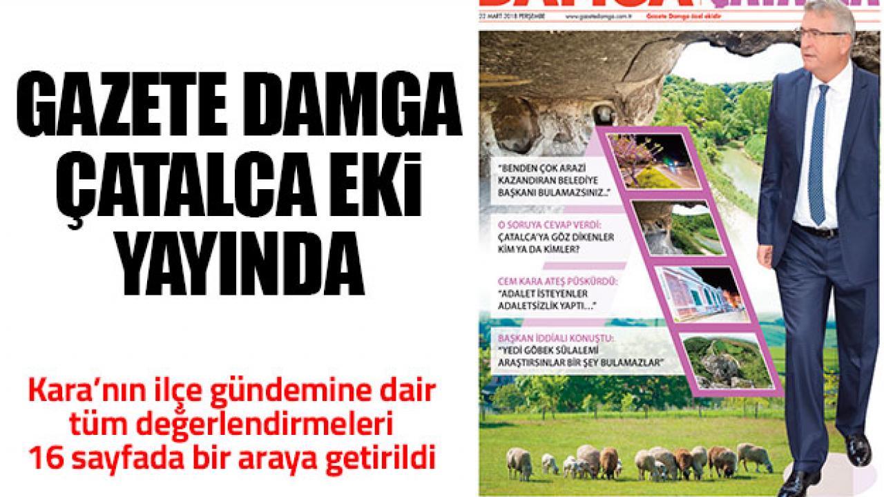 Gazetemizin başlattığı 'Aylık Buluşmalar' kapsamında Damga Yazı İşleri'nin konuğu olan ve soruları cevaplayan Çatalca Belediye Başkanı Cem Kara'nın açıklamalarını Damga Çatalca ekiyle siz değerli okuyucularımıza sunuyoruz. 16 sayfalık Damga Çatalca ekinde ilçenin bütün sorunları ve çözüm yolları masaya yatırıldı. Bütün sorulara cevap veren Cem Kara, ilçenin dününü ve bugününü değerlendirdi. Bugün gazetemizle birlikte dağıtılacak Damga Çatalca'yı dağıtıcınızdan istemeyi unutmayın.