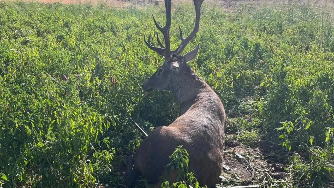 Gaziantep’in İslahiye ilçesinde biber tarlasında sulama hortumuna dolanarak bitkin düşen yaban geyiği, vatandaşların yardımıyla bulunduğu yerden kurtarıldı.