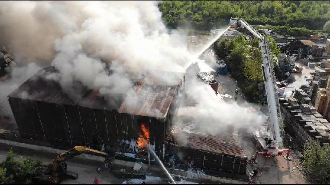 Kocaeli'nin Kartepe ilçesinde geri dönüşüm tesisinde yangın çıktı. Alevlerin yükseldiği yangın dronla havadan görüntülendi.