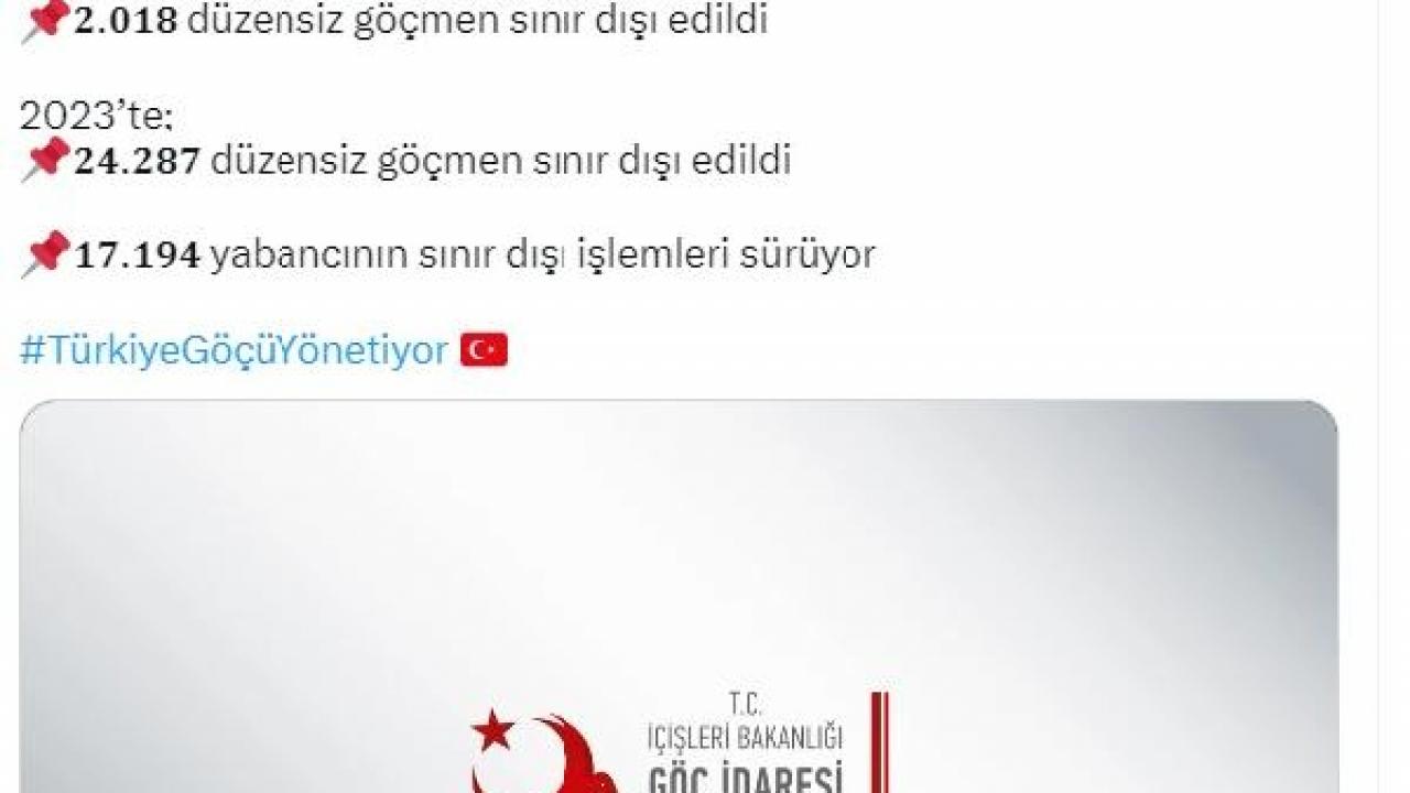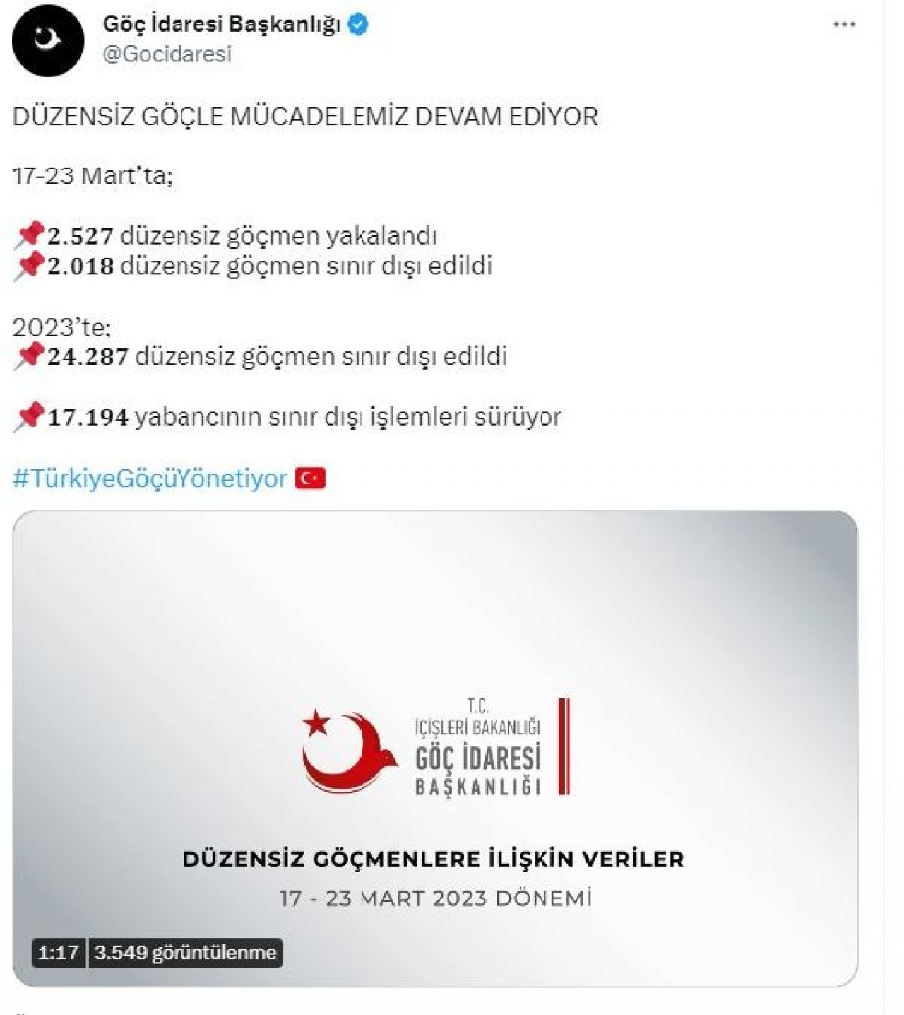 Göç İdaresi Başkanlığınca yapılan açıklamaya göre; 17- 23 Mart tarihleri arasında, 2 bin 527 kaçak göçmen yakalandı ve yakalanan kaçakların 2 bin 18'i sınır dışı edildi. 2023'te ise toplam 24 bin 287 kaçak göçmen sınır dışı edilirken, 17 bin 194 yabancının sınır dışı işlemlerinin devam ettiği belirtildi. (DHA)