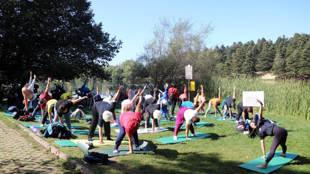 Bolu'da hafta sonu güneşli havaya fırsat bilenler Gölcük Tabiat Parkı'na akın etti. İstanbul'dan gelen 90 kişilik grup çam ağaçları arasındaki tabiat parkında göl kenarında yoga yaptı.