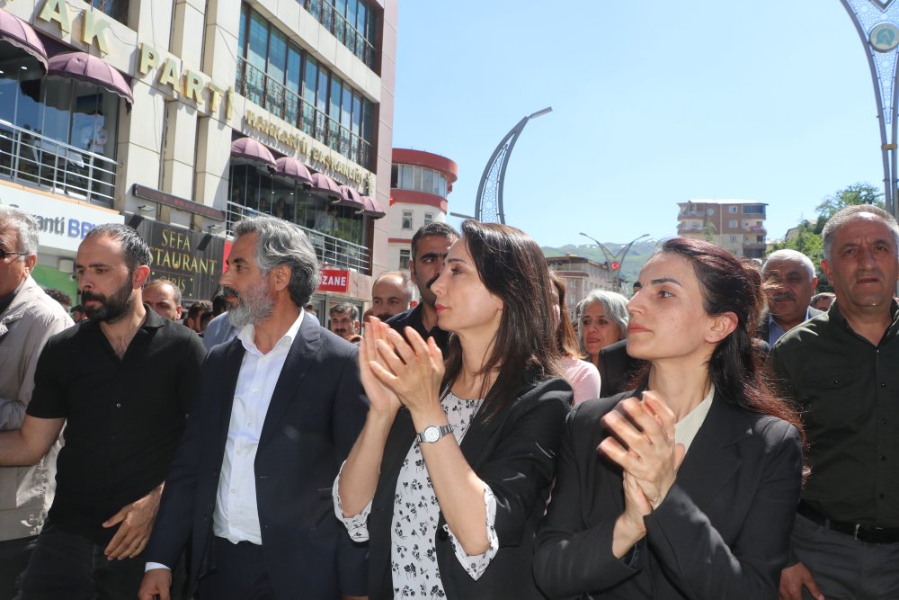 Hakkari'ye gelen DEM Parti Eş Genel Başkanı Tülay Hatimoğulları, DBP Eş Genel Başkanları Çiğdem Kılıçgün Uçar ile Keskin Bayındır, DEM Parti milletvekillerinin de içerisinde bulunduğu kalabalık tarafından karşılandı. Van, Diyarbakır, Mardin ve ilçe belediye eş başkanları, DEM Parti milletvekillerinin de bulunduğu kalabalık grup, sık sık "Kayyım istemiyoruz, irademizi istiyoruz" sloganları attı.
