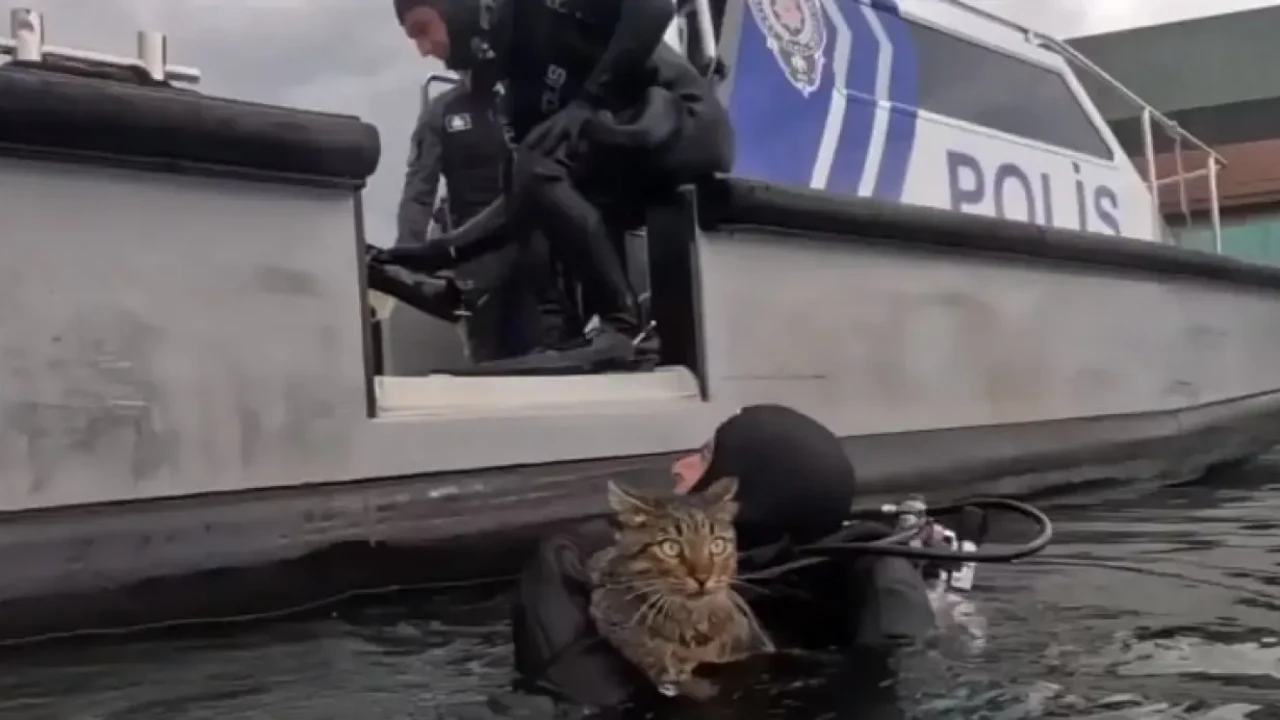 Edinilen bilgiye göre, Haliç kıyısında beton blokların arasında mahsur kalan kediyi fark eden çevredeki vatandaşlar, durumu polis ekiplerine bildirdi. Olay yerine gelen İstanbul Emniyet Müdürlüğü Deniz Polisi ekipleri, kısa sürede dalış hazırlıklarını tamamlayarak kurtarma çalışmasına başladı.