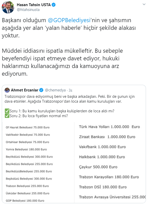 Hürriyet Fenerbahçe muhabiri Ahmet Ercanlar'ın bu sabah birçok belediye ile ilgili olarak paylaştığı kombine ücretleri listesinde Gaziosmanpaşa Beleidyesi de yer alıyordu. 180 bin euroya alındığı öne sürülen kombine ile ilgili olarak açıklamada bulunan Gaziosmanpaşa Belediye Başkanı Hasan Tahsin Usta, iddiaları yalanladı ve hukukü haklarını kullanacaklarını duyurdu.