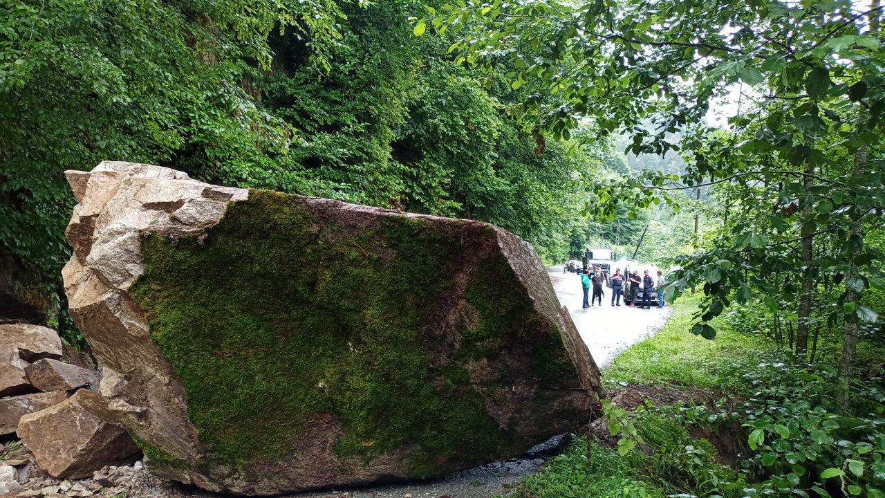 DHA- Rize'nin Çayeli ilçesine bağlı Gürpınar köyünde meydana gelen heyelanda yamaçtan kopan dev kaya yola düştü. Rize İl Özel İdaresi ekipleri, iş makinası ile kayayı kaldırarak kapanan yolu ulaşıma açtı.