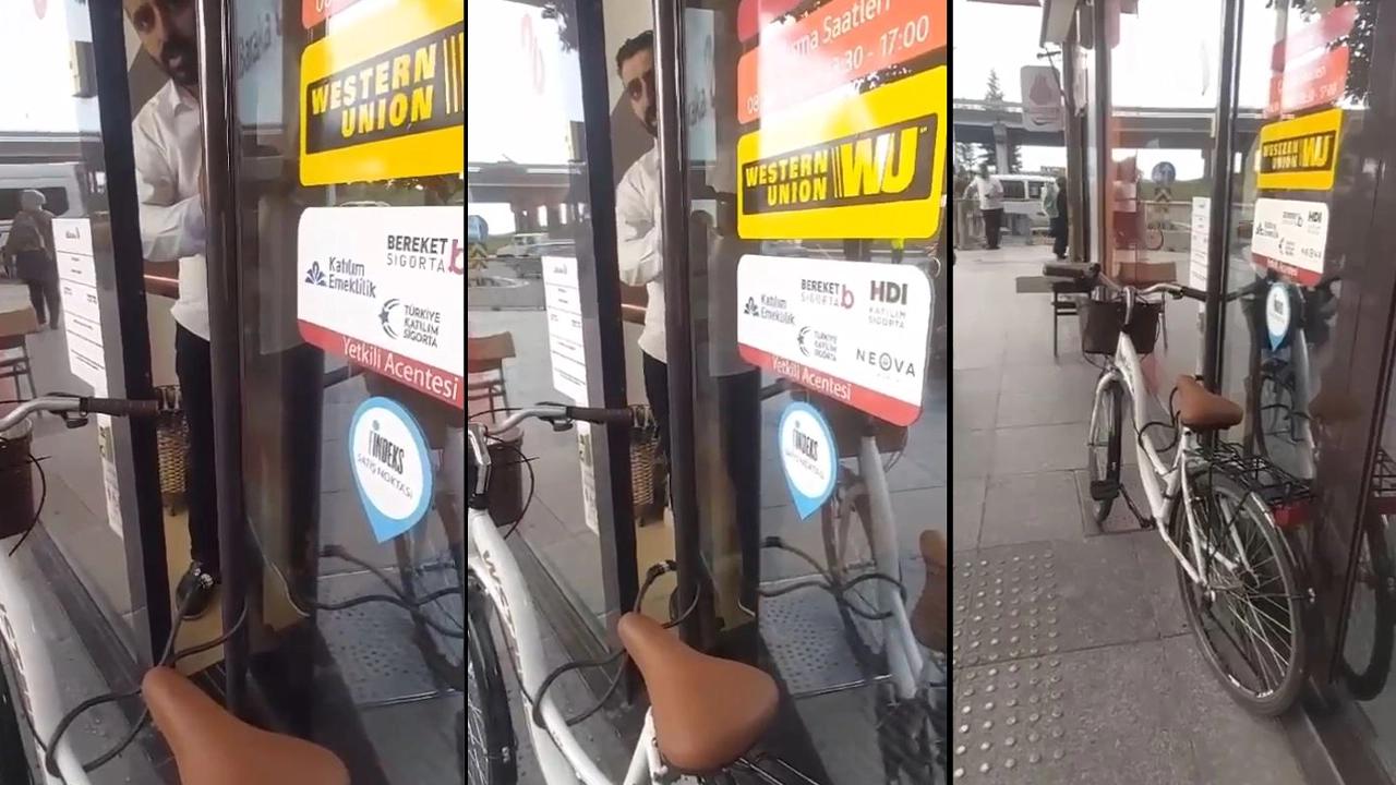 Olay dün akşam saatlerinde Yeniköy Mahallesi Tevfik İleri Caddesi üzerinde yer alan özel bir bankada meydana geldi. Kimliği belirlenemeyen bir kişi, çalınmasından endişe ettiği bisikletini bankanın cam kapı koluna kilitledi.