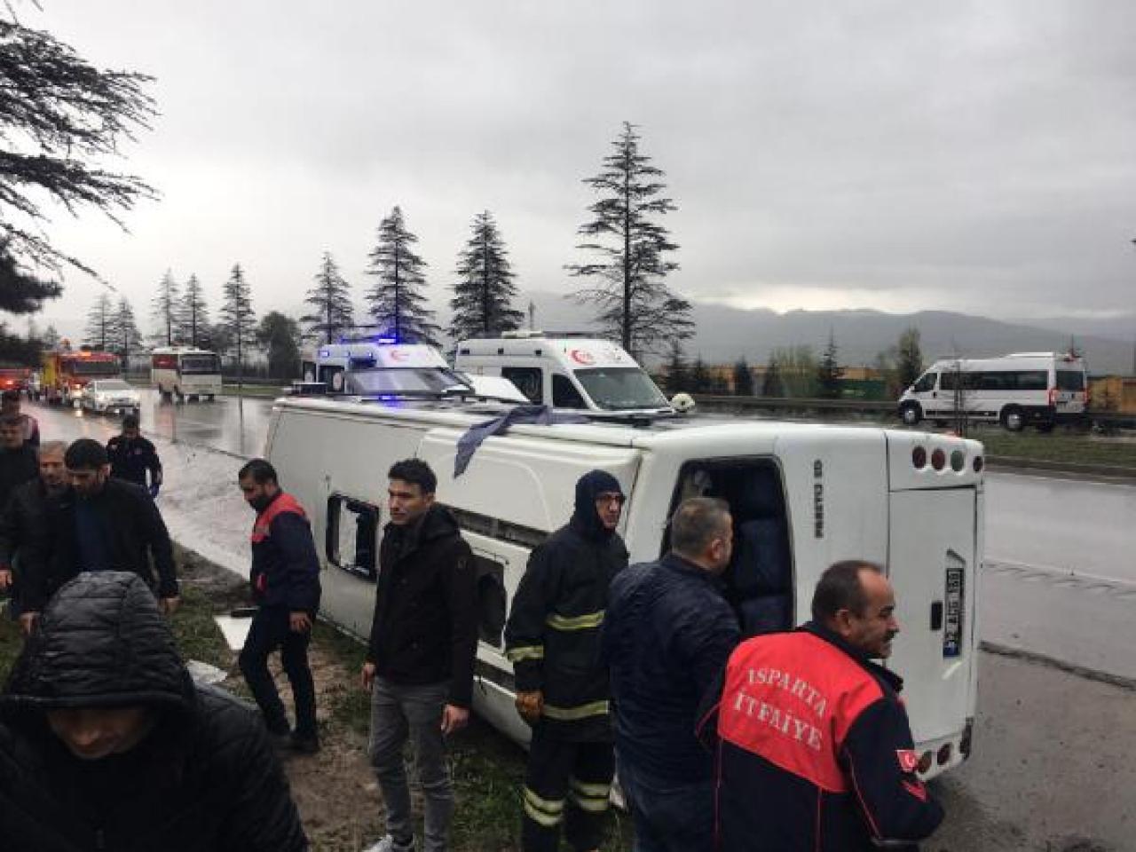 DHA- Kaza, saat 08.30 sıralarında, Isparta- Afyonkarahisar kara yolunun 17'nci kilometresinde meydana geldi. Kamil Bildirici'nin kullandığı 32 ACG 168 plakalı işçi servis midibüsü, Göltaş Çimento Fabrikası mevkisinde yağışlı havanın etkisiyle sürücünün direksiyon kontrolünü kaybetmesi sonucu yoldan çıkıp şarampole devrildi.