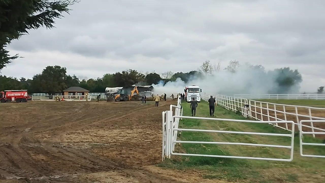 Ahırdaki atlar çiftlikten tahliye edilirken yangın itfaiye ekipleri tarafından söndürüldü. Yangında 200 balya saman ve saklandığı depo zarar gördü.