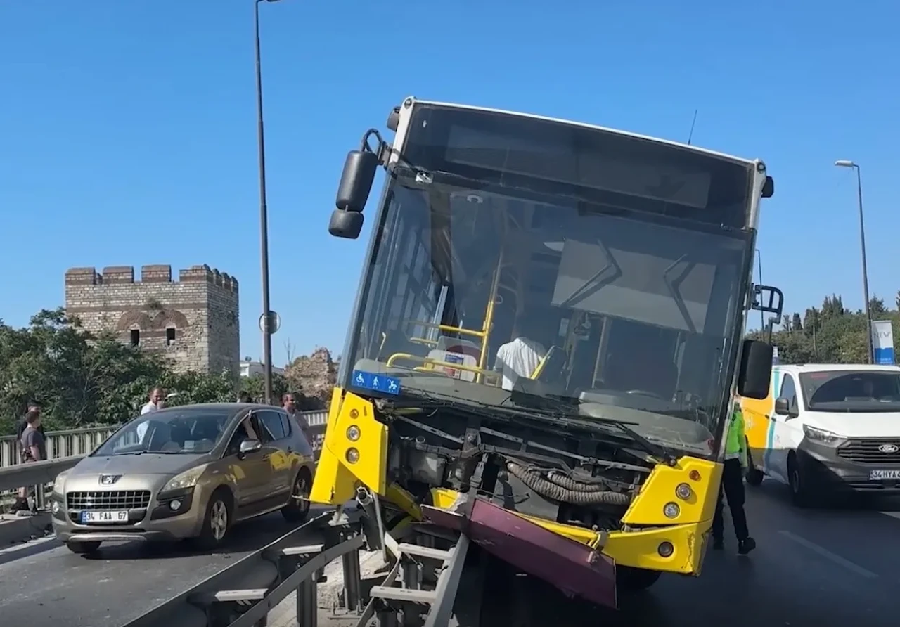 Fatih’te sabah saatlerinde meydana gelen kazada bir İETT otobüsü çelik bariyerlerin üzerine çıkarak asılı kaldı. Topkapı Mahallesi’ndeki 10'uncu Yıl Caddesi'nde yaşanan olayda, otobüs sürücüsünün direksiyon hakimiyetini kaybetmesi sonucu zincirleme bir kaza meydana geldi.