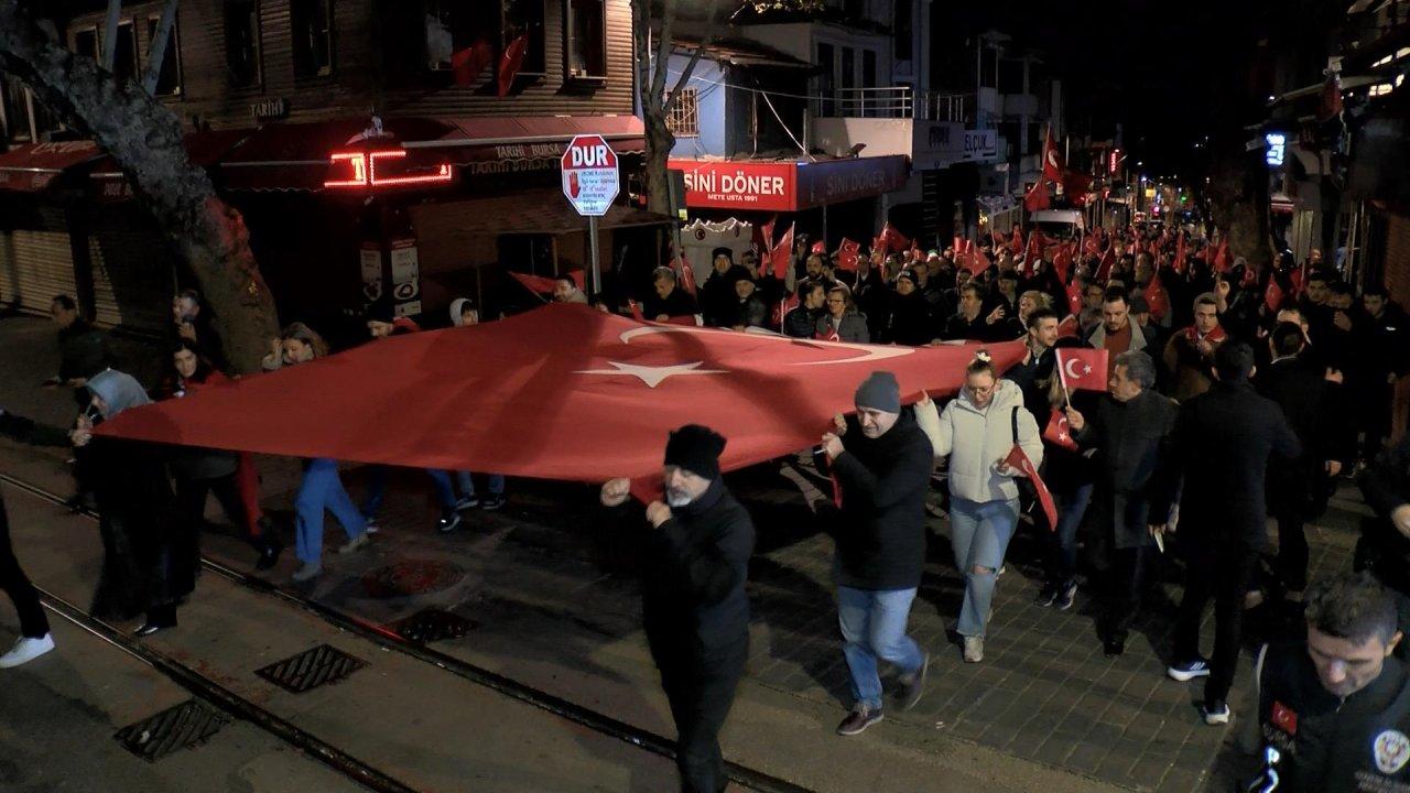 Yaklaşık 200 kişinin katıldığı yürüyüşün ardından konuşma yapan İYİ Parti Bursa Milletvekili Selçuk Türkoğlu, "Bu mevzu vatan mevzuu, bu mevzu millet mevzuu, bu mevzu bizim geleceğimizin mevzusu. O yüzden ne bir parti bayrağımız var ne de ismi var. Bu mevzuyu siyaset üstü bir vatan mevzusu görerek diyoruz ki, Meclis'te PKK istemiyoruz" dedi.