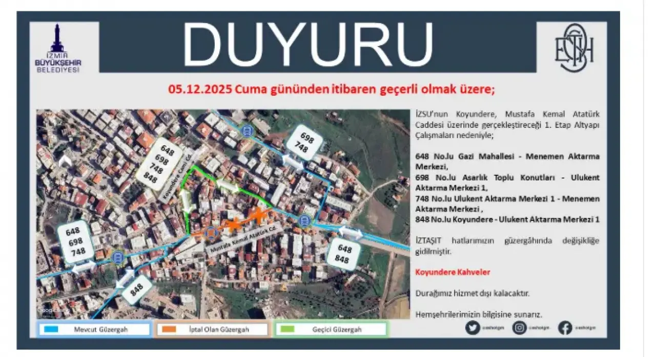 ESHOT tarafından yapılan bilgilendirmede, İZSU’nun Koyundere Mustafa Kemal Atatürk Caddesi üzerindeki 1. Etap altyapı çalışmaları sebebiyle yukarıdaki hatlarda güzergâh değişikliğine gidildiği ve 05.12.2025 Cuma gününden itibaren uygulamanın başlayacağı ifade edilerek, vatandaşların bilgisine sunulduğu aktarıldı.