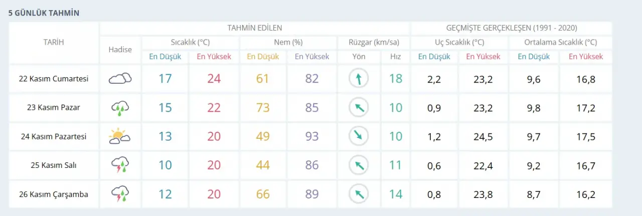 22 Kasım Cumartesi: Çok bulutlu bir hava bekleniyor. Sıcaklık 24 derece civarında seyredecek. Bazı ilçelerde aralıklı yağış geçişleri görülebilir.