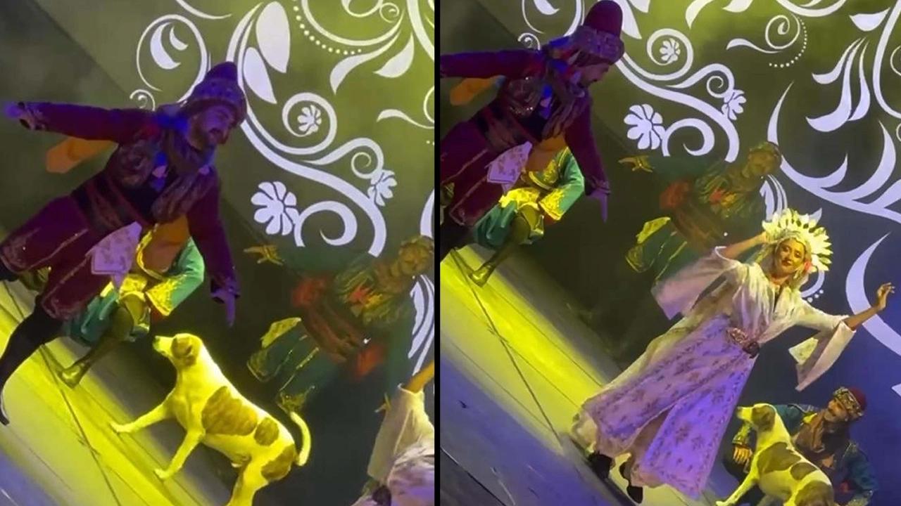 Sokak köpeğin sahnedeki oyuncuları tek tek dolaşarak koklaması kameralara yansıdı.