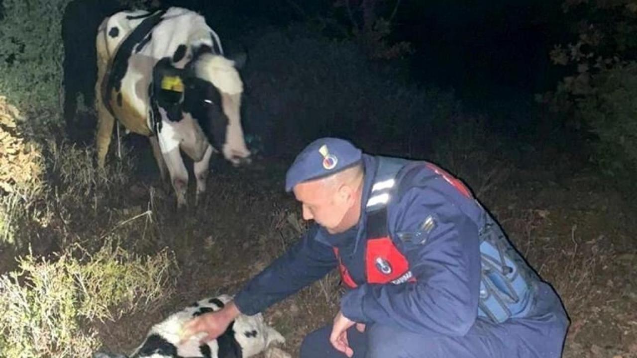 Kırklareli'nin Vize ilçesinde jandarma ekipleri, kayıp olduğu düşünülen gebe ineği ormanlık alanda buzağılamış halde buldu...