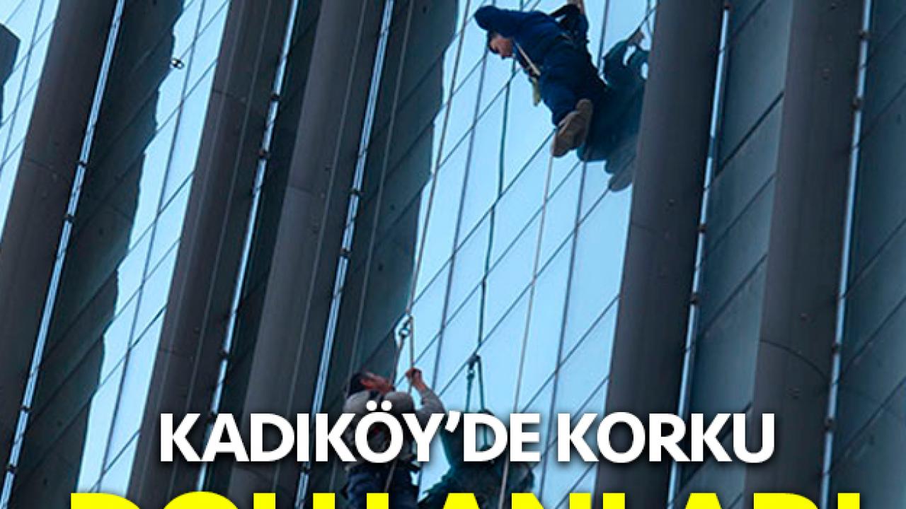 Kadıköy'de 20 katlı binanın dış cephesinde temizlik yaparken halatların kopması sonucu asılı kalan 2 işçi kurtarıldı.
