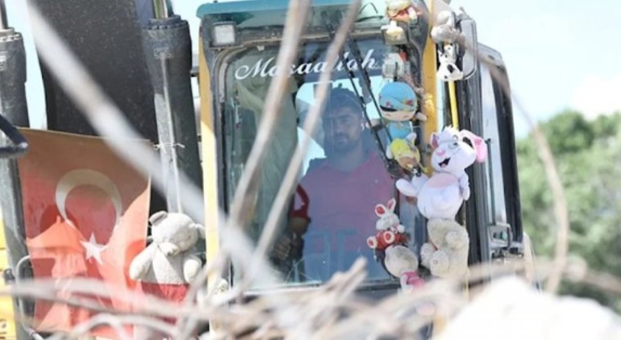 "Defne ilçesi tarafında çalışıyorduk, üç katlı bir bina yıktım. Makinedeki kırmızılı büyük ayıcığın sahibi 12-13 yaşlarında bir erkek kardeşimiz geldi, 'Abi bu benim' dedi, gözümden yaş geldi. Nereden çıkarttığımı sordu, 'bu binadan' deyince kendisinin olduğunu söyledi. Makineden söküp kendisine verdim. 'Abi ben ne yapayım, evim yıkıldı, senin yanında daha rahat olur, ben ne yapabilirim ki buna. Makineye as bizim hatıramız olsun' dedi. Çok duygulandık. Bazen ayıcıklar çıkıyor makineyi durduruyoruz. Bakıyoruz ya acaba bunların yerinde biz olsaydık, kardeşimiz olsaydı, yeğenimiz olsaydı ne yapacaklardı? Allah kimseye yaşatmasın. Çok üzüntümüz var. İnşallah toparlanacak, toparlamaya da başlayacağız."