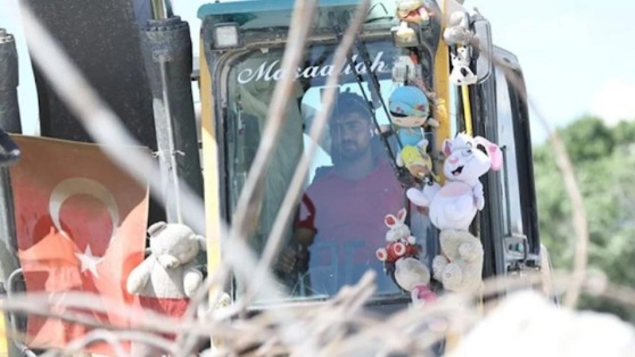 Enkazlardan çıkan oyuncakları atmaya kıyamayan Hüsnüoğlu, ayıcıkların çoğunlukta olduğu oyuncakları operatörlüğünü yaptığı kepçesine asmaya başladı.